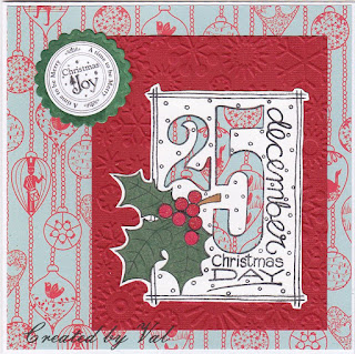 Great stamp and super card Val. I ended up so rushed at the end of last year I intend to make some Christmas cards each month, to make sure I have a head start.
